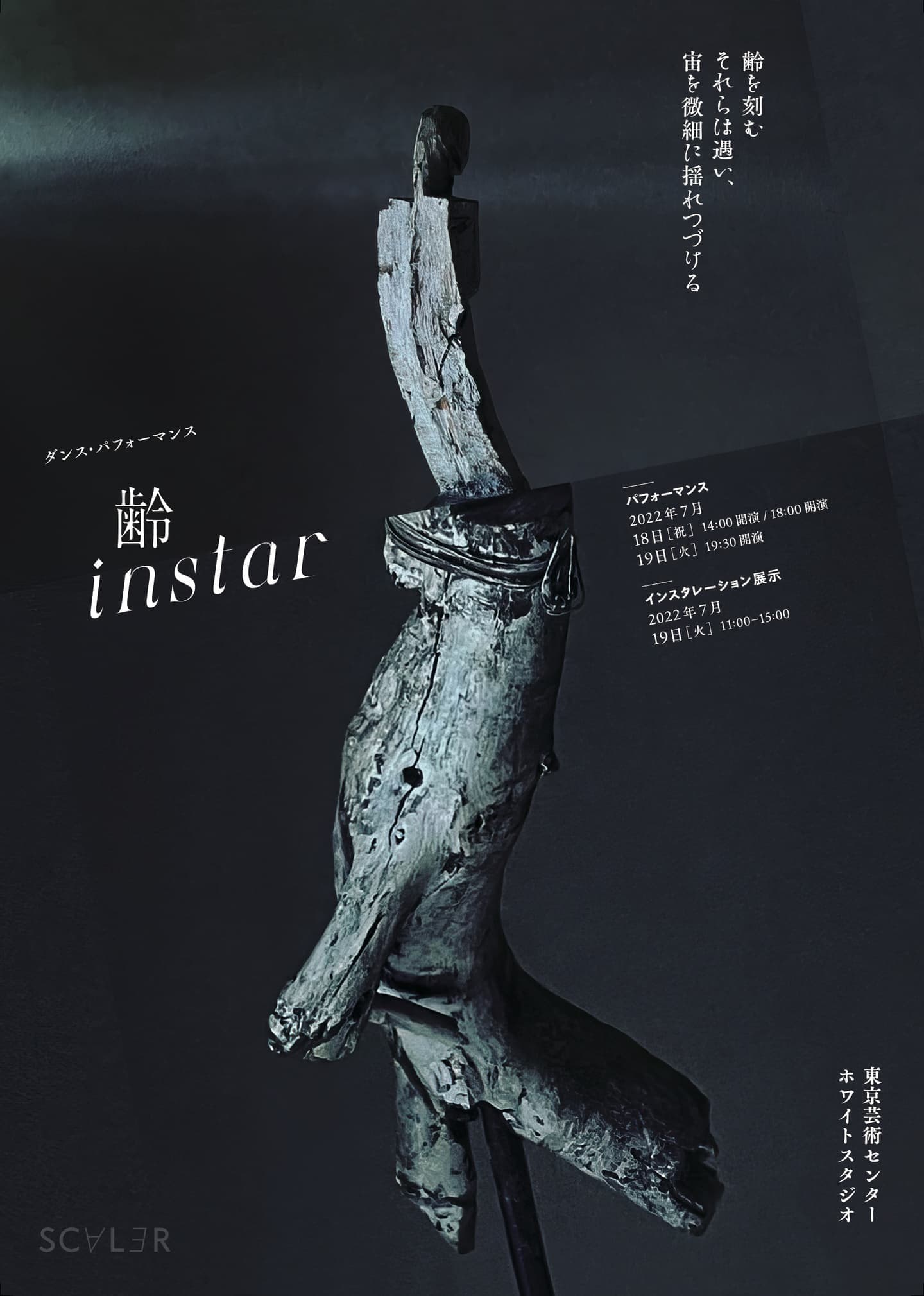 非常にたくさんのものごとが起き、無意識のうちに膨大な情報が体内に入ってくる現代社会において、静かに「内在するもの」を感じようとすること、「気づき」という繊細な実践に、豊かさの本質を見出せるのではないでしょうか。それは、遠いものと近いものを行き来するような、いくつかの原理から出発して無限に大きなものを目指すこと、無限に小さなものに耳を澄まそうとすることでもあり、訪れる矛盾や違和感を受け入れることの模索でもあります。『齢 instar』では、時間や空間など、目に見えず、実体のないものに対して、人間の身体だからこそ表現できること、人間だから感知できることの「相互関係」で作品を構築することを試みています。